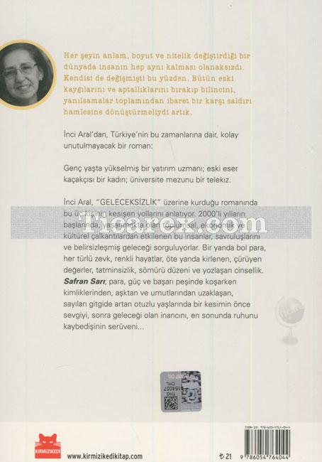 İnci Aral, "GELECEKSİZLİK" üzerine kurduğu romanında bu üç kişinin kesişen yollarını anlatıyor. 2000'li yılların başlarında, yaşanmakta olan toplumsal, ekonomik ve kültürel çalkantılardan etkilenen bu insanlar, savruluşlarını ve belirsizleşmiş geleceği sorguluyorlar. Bir yanda bol para, her türlü zevk, renkli hayatlar, öte yanda kirlenen, çürüyen değerler, tatminsizlik, sömürü düzeni ve yozlaşan cinsellik. Safran Sarı; para, güç ve başarı peşinde koşarken kimliklerinden, aşktan ve umutlarından uzaklaşan, sayıları gitgide artan otuzlu yaşlarında bir kesimin önce sevgiyi, sonra geleceği olan inancını, en sonunda ruhunu kaybedişinin serüveni...