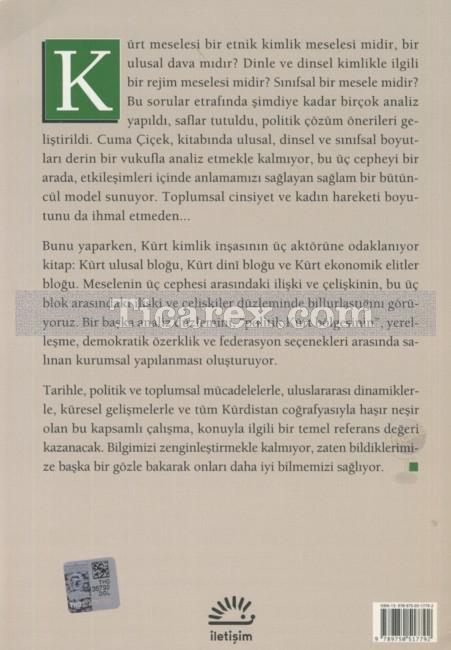 Kürt meselesi bir etnik kimlik meselesi midir, bir ulusal dava mıdır? Dinle ve dinsel kimlikle ilgili bir rejim meselesi midir? Sınıfsal bir mesele midir? Bu sorular etrafında şimdiye kadar birçok analiz yapıldı, saflar tutuldu, politik çözüm önerileri geliştirildi. Cuma Çiçek, kitabında ulusal, dinsel ve sınıfsal boyutları derin bir vukuflaanaliz etmekle kalmıyor, bu üç cepheyi bir arada, etkileşimleri içinde anlamamızı sağlayan sağlam bir bütüncül model sunuyor. Toplumsal cinsiyet ve kadın hareketi boyutunu da ihmal etmeden... Bunu yaparken, Kürt kimlik inşasının üç aktörüne odaklanıyor kitap: Kürt ulusal bloğu, Kürt dinî bloğu ve Kürt ekonomik elitler bloğu. Meselenin üç cephesi arasındaki ilişki ve çelişkinin, bu üç blok arasındaki ilişki ve çelişkiler düzleminde billurlaştığını görüyoruz. Bir başka analiz düzlemini, "politik Kürt bölgesinin", yerelleşme, demokratik özerklik ve federasyon seçenekleri arasında salınan kurumsal yapılanması oluşturuyor. Tarihle, politik ve toplumsal mücadelelerle, uluslararası dinamiklerle, küresel gelişmelerle ve tüm Kürdistan coğrafyasıyla haşır neşir olan bu kapsamlı çalışma, konuyla ilgili bir temel referans değeri kazanacak. Bilgimizi zenginleştirmekle kalmıyor, zaten bildiklerimize başka bir gözle bakarak onları daha iyi bilmemizi sağlıyor