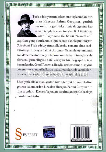 Türk edebiyatının kilometre taşlarından biri olan Hüseyin Rahmi Gürpınar, günlük yaşamı dile getirirken mizah öğesini her zaman ön plana çıkartmıştır. Bu kitapta yer alan Gulyabani ve Gönül Ticareti adlı yapıtları genç okurlarımız için özenle sadeleştirilmiştir. Türk edebiyatının ilk korku romanı olma özelliği taşıyan Gulyabani'de Hüseyin Rahmi Gürpınar, Osmanlı toplumunun son dönemlerinde geçen bu romanında batıl inançları ele alırken güncelliğini hala koruyan bir başyapıt ortaya koymaktadır. Gönül Ticareti adlı öykü derlemesinde ise yine döneminin İstanbul halkının mahalle aralarında yaşadıkları, evlerin içinde olup bitenler büyük bir canlılıkla çizilir.