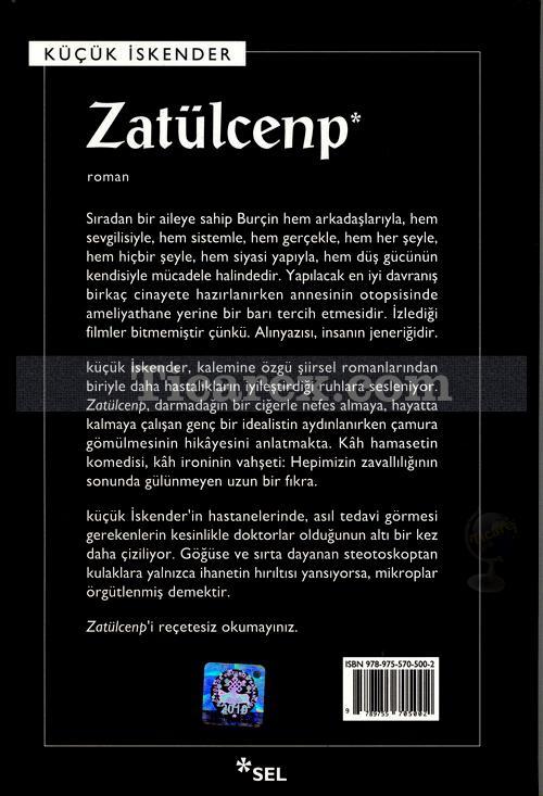 Küçük İskender, kalemine özgü şiirsel romanlarından biriyle daha hastalıkların iyileştirdiği ruhlara sesleniyor. Zatülcenp, darmadağın bir ciğerle nefes almaya, hayatta kalmaya çalışan genç bir idealistin aydınlanırken çamura gömülmesinin hikâyesini anlatmakta. Kâh hamasetin komedisi, kâh ironinin vahşeti: Hepimizin zavallılığının sonunda gülünmeyen uzun bir fıkra.