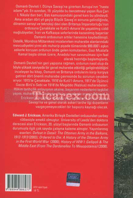 Hâkim tarihçilik anlayışının aksine, başarının nedenlerini teşkilat yapısı, muharip lider kadrosu gibi iç unsurlarda arayan Edward J. Erickson'ın bu kitabı, içerdiği yeni açılımlarla Birinci Dünya Savaşı'na ve genel olarak askeri tarihe ilgi duyanların vazgeçemeyecekleri bir başvuru kaynağı olacak.
