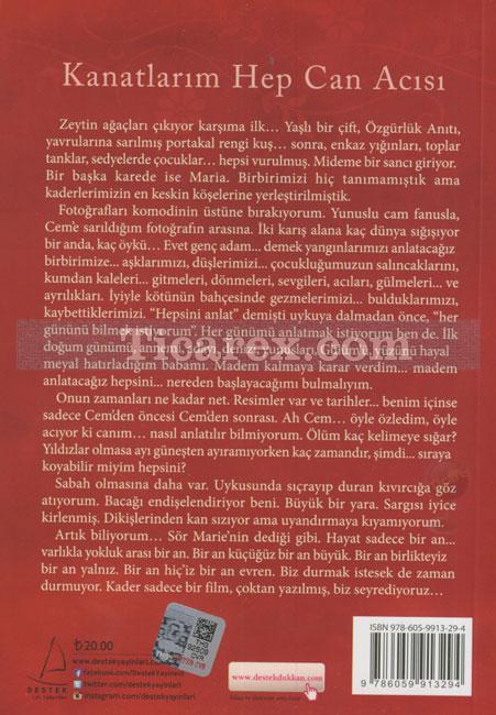 Zeytin ağaçları çıkıyor karşıma ilk... Yaşlı bir çift, Özgürlük Anıtı, yavrularına sarılmış portakal rengi kuş... sonra, enkaz yığınları, toplar tanklar, sedyelerde çocuklar... hepsi vurulmuş. Mideme bir sancı giriyor. Bir başka karede ise Maria. Hiç tanışmadığım ama benimle hayatı değişen Maria. Fotoğrafları komodinin üstüne bırakıyorum. Yunuslu cam fanusla, Cem'e sarıldığım fotoğrafın arasına. İki karış alana kaç dünya sığışıyor bir anda, kaç öykü... Evet genç adam... demek yangınlarımızı anlatacağız birbirimize... aşklarımızı, düşlerimizi... çocukluğumuzun salıncaklarını, kumdan kaleleri... gitmeleri, dönmeleri, sevgileri, acıları, gülmeleri... ve ayrılıkları. İyiyle kötünün bahçesinde gezmelerimizi... bulduklarımızı, kaybettiklerimizi. "Hepsini anlat" demişti uykuya dalmadan önce, "her gününü bilmek istiyorum". Her günümü anlatmak istiyorum ben de. İlk doğum günümü, annemi, adayı, denizi, yunusları, Gülüm'ü, yüzünü hayal meyal hatırladığım babamı. Madem kalmaya karar verdim... madem anlatacağız hepsini... nereden başlayacağımı bulmalıyım.