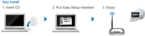 Kolay Kurulum Yardımcısını içeren bir CD ile gelen cihazda sihirbaz size adım adım kurulumda, hatta kablosuz ağ ayarları ve güvenlik tanımları aşamalarında dahi özellikle deneyimsiz kullanıcılar için son derece faydalı olacak şekilde yol gösterecektir.
