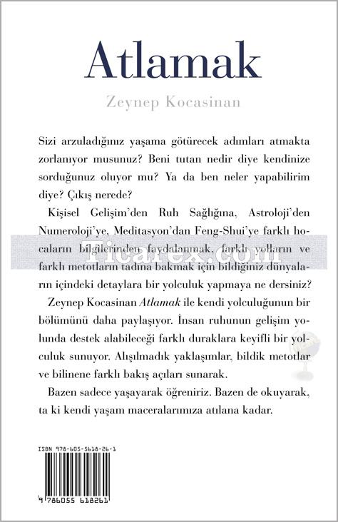 Zeynep Kocasinan Atlamak ile kendi yolculuğunun bir bölümünü daha paylaşıyor. İnsan ruhunun gelişim yolunda destek alabileceği farklı duraklara keyifli bir yolculuk sunuyor. Alışılmadık yaklaşımlar, bildik metotlar ve bilinene farklı bakış açıları sunarak.