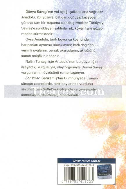 Dünya Savaşı´nın yol açtığı çalkantılarla yoğrulan Anadolu, 20.yüzyıla,batıdan doğuya,kuzeyden güneye tam bir kuşatma altında girmektedir.Oysa Anadolu,tarih boyunca koynunda barınanları ayrımsız kucaklayan;karlı dağlarını, verimli ovalarını, berrak akarsularını, ak sütünü sunan müşfik bir anadır. Nalan Tuntaş, işte bu duyarlığını işleyerek; kurgusuyla, olay örgüsüyle Dünya Savaşı yorgunlarını romanlaştırıyor. Zor Yıllar, Sarıkamış´tan Cumhuriyet´e uzanan süreçte cephelerde, sınır boylarında yurdunu savunan Sarı Saffet´in kişiliğinde ve onun çevresinde somutlaş Mehmetçiğin destanıdır.