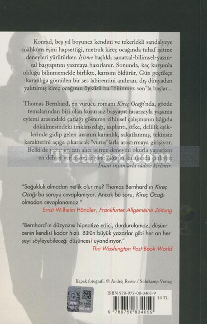 Thomas Bernhard, en vurucu romanı Kireç Ocağı'nda, gözde temalarından biri olan kusursuz başyapıt tasarısıyla yaşama eylemi arasındaki çatlağı gösteren zihinsel çalışmanın kâğıda dökülmesindeki imkânsızlığı, saplantı, öfke, delilik eşiklerinde gidip gelen insanın karanlık, sakatlanmış, tekinsiz karakterini açığa çıkaracak "vuruş"larla araştırmaya girişiyor. Belki de yazar en can alıcı işitme deneyini okurla yaparken en dehşet verici cümle yine okurun kulağında çınlıyor: İnsan insanlarla sadece kirlenir.