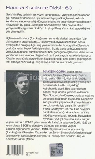 Gorki'nin Rus tarihinin 19. yüzyıl sonundan 20. yüzyıl başlarına uzanan çok önemli bir dönemine ışık tutan otobiyografik üçlemesi, aslında kendini ve içinde yaşadığı dünyayı anlama ve anlamlandırma çabasının hikâyesidir. Bu çaba, Ekmeğimi Kazanırken'de artık hayata atılan yeniyetmelik çağındaki Gorki'yi 19. Yüzyıl Rusya'sının katı gerçekliğiyle yüz yüze getirir.