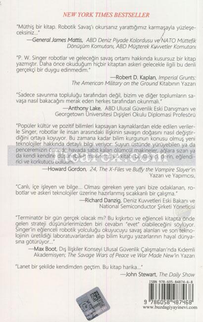 "Terminatör bir gün gerçek olacak mı? Bu kışkırtıcı ve eğlenceli kitapta önde gelen strateji düşünürlerimizden biri cevabın "evet" olabileceğini söylüyor. Singer'in eğlenceli robotik yolculuğu okuyucuyu savaş alanları ve son teknolojinin üretildiği laboratuvarlardan alıp bilim kurgu yazarlarının hayal dünyasına götürüyor..."