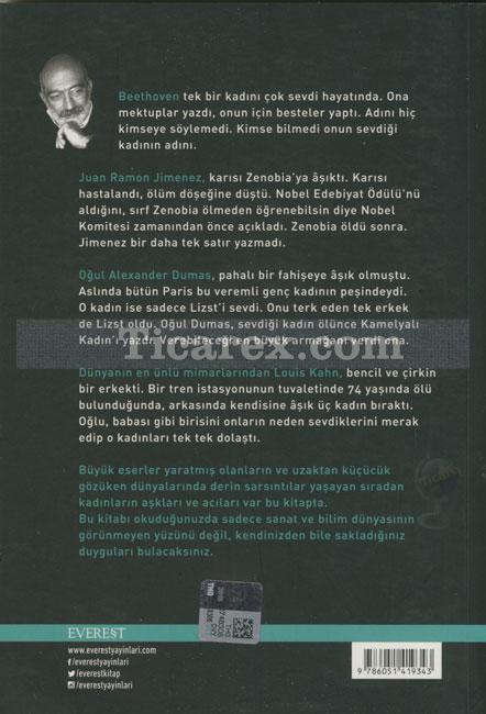 Büyük eserler yaratmış olanların ve uzaktan küçücük gözüken dünyalarında derin sarsıntılar yaşayan sıradan kadınların aşkları ve acıları var bu kitapta. Bu kitabı okuduğunuzda sadece sanat ve bilim dünyasının görünmeyen yüzünü değil, kendinizden bile sakladığınız duyguları bulacaksınız. Beethoven tek bir kadını çok sevdi hayatında. Ona mektuplar yazdı, onun için besteler yaptı. Adını hiç kimseye söylemedi. Kimse bilmedi onun sevdiği kadının adını. Juan Ramon Jimenez, karısı Zenobia'ya âşıktı. Karısı hastalandı, ölüm döşeğine düştü. Nobel Edebiyat Ödülü'nü aldığını, sırf Zenobia ölmeden öğrenebilsin diye Nobel Komitesi zamanından önce açıkladı. Zenobia öldü sonra. Jimenez bir daha tek satır yazmadı.