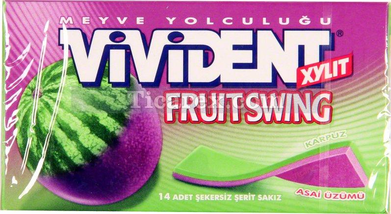 Vivident Fruit Swing, Karpuz&Asai Üzümü Brezilyanın yağmur ormanlarından gelen süper meyve, tropik asai üzümü ve karpuz aroması ile size adeta bir meyve yolculuğu yaşatıyor. 2 kattan oluştuğu için tat geçişleri benzersiz bir meyve yolculuğu hissi veriyor.